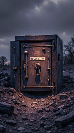 That the image is generated using AI. Weathered safe in desolate landscape symbolizing economic recession and uncertainty.