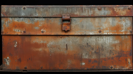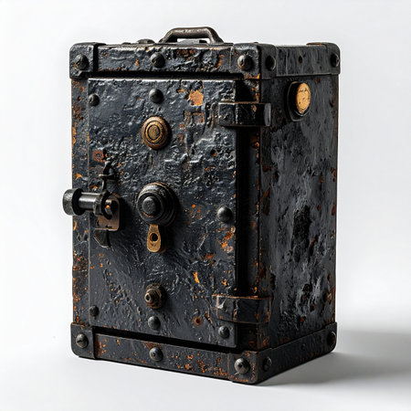 An old, weathered steel safe, covered in rust and rivets, stands as a silent guardian of forgotten secrets.