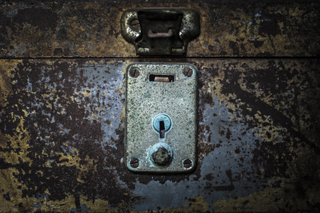 Old padlock secured on a vintage trunk in a dusty attic space
