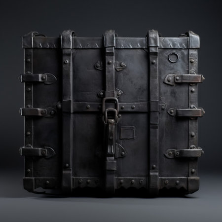 An ancient, heavily-riveted metal safe, weathered by time and showing patches of rust, stands isolated.