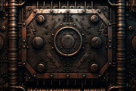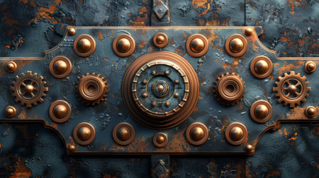 An old vintage bank vault safe door that creates a nice industrial steampunk background. This image is a metaphor for money, security, finance, and banking. Perfect for use in design projects related to finance, banking, or security.