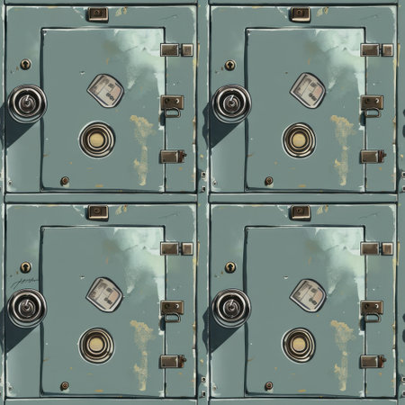 Industrial themed pattern with metal safes reflecting financial security.