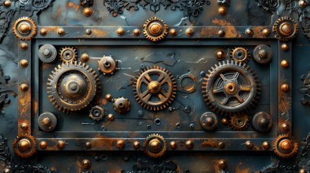 Vintage steampunk frame with blue background and old mechanism 3D illustration