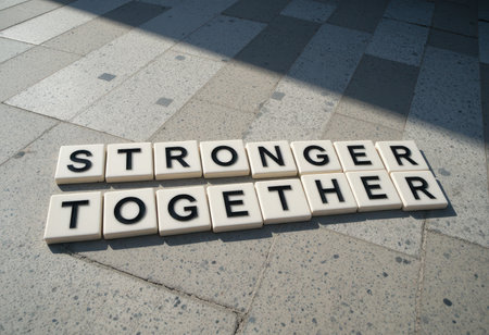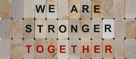 This image features the phrase Stronger Together displayed artistically using letter tiles against a neutral background, symbolizing unity and empowerment.