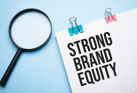 Magnifying glass loupe with sign STRONG BRAND EQUITY on the paper notepad wtih colored paper clips on the blue table.