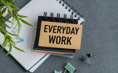 A notebook with a sign that says Everyday Work on it. The notebook is on a table with a pair of scissors and a pair of paper clips