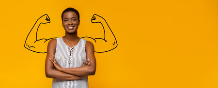 Portrait of an african american female woman standing with her two diverse friends flexing their muscle in the park - 3 woman showing strength and woman power - 3 females flexing biceps