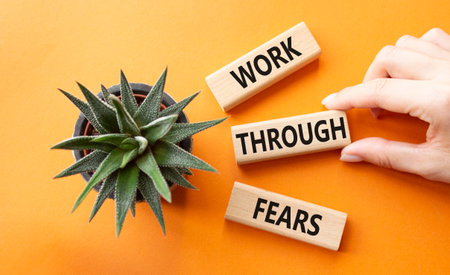 Work through fears. Wooden blocks with words Work through fears. Beautiful orange background. Businessman hand. Business and Work through fears concept. Copy space.
