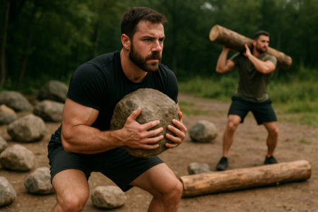 Two muscular men performing strength training exercises with natural weights in a forest setting, embodying fitness and determination