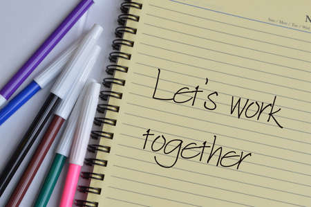 Top view of pen colors and notebook written with text LET'S WORK TOGETHER.