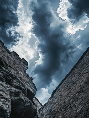 Dramatic Stone Walls Skyward View Ancient Ruins Cloudy Day Old Grey Blue Dark Rock High Moody Image