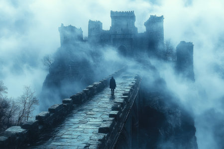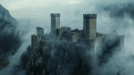 A haunting image of an ancient castle ruins enveloped in fog. The mystical ambiance and weathered stonework create a sense of history and solitude.
