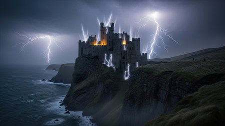 AI Generated. Spooky castle on a rocky hill illuminated by lightning strikes under a haunting stormy sky