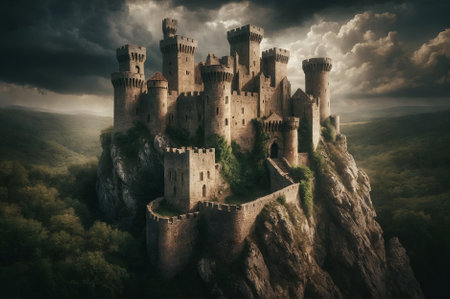 A breathtaking view of a majestic mountain fortress sits atop a rugged hill, surrounded by vibrant greenery and dramatic storm clouds, evoking a sense of mystery and history.