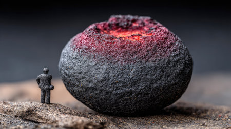 A miniature figure of a person standing on a lava stone. Conceptual image.