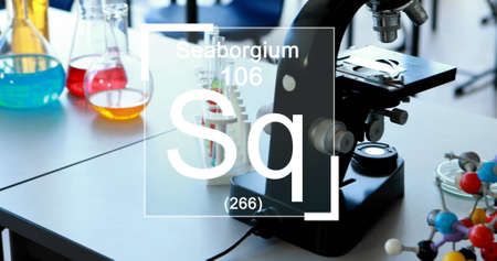 Image of chemistry elements icons over beakers on desk. education, development and learning concept digitally generated image.