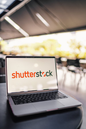 New York, USA - 9 April 2020: Shutterstock website on laptop screen close up. Man using service on display, blurry background, Illustrative Editorial.