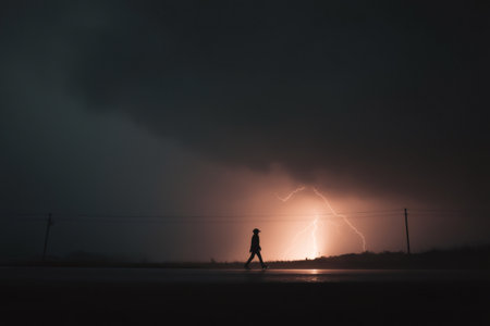 Silhouette of a farmer walking on a wet road during a thunderstorm with lightning striking the ground in the background