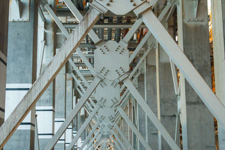 Steel structure of the bridge over the river, steel trusses, closeup of photo