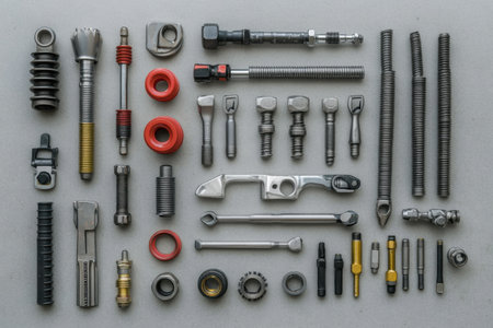 A detailed arrangement of various mechanical parts and components showcasing the intricate design and engineering used in modern machinery and tools.