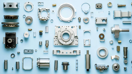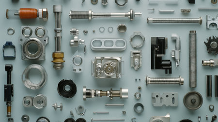 A stunning aerial view of assorted metal mechanical parts and components laid out on a light background, showcasing precision engineering and modern manufacturing techniques.