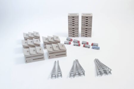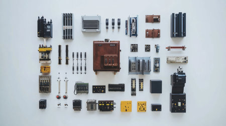 A visually appealing arrangement of various industrial electronic components on a clean white background, suitable for technology, engineering, and manufacturing themes.