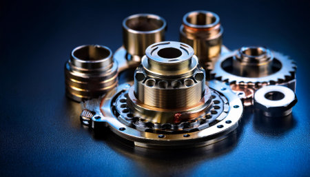 This image showcases a variety of mechanical components including gears and shafts arranged on a dark background, reflecting precision and industrial design.