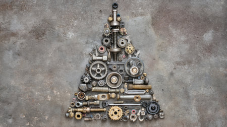 This artistic representation uses various metallic tools and parts to visually depict a Christmas tree, merging industrial aesthetics with holiday spirit.