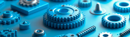 An intricate collection of small mechanical parts and components displayed against a vibrant blue background, showcasing an array of textures and designs.