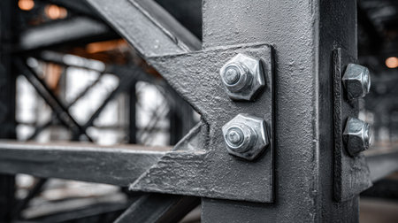 A meticulous close-up of a robust steel structure showcasing bolts and nuts, emphasizing the strength and precision of construction in an urban setting.