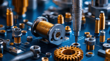 Explore a meticulously organized collection of mechanical parts and tools set against a dark blue background, perfect for design and creative projects.