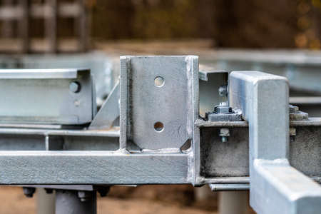 metal beam, silver color support with bolts, clean metal construction texture with copy space. Top view building element. Industrial abstract background with steel structure with rivets