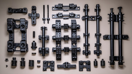 An extensive collection of black engineering components meticulously arranged on a neutral background, showcasing mechanical parts for industrial creativity.
