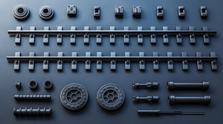 A captivating flat lay of industrial components showcases the beauty of design with an elegant arrangement of various pieces on a dark background.