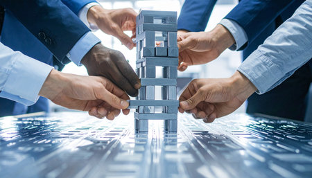 A diverse group of business professionals carefully collaborates, their hands working in unison to construct a complex tower.