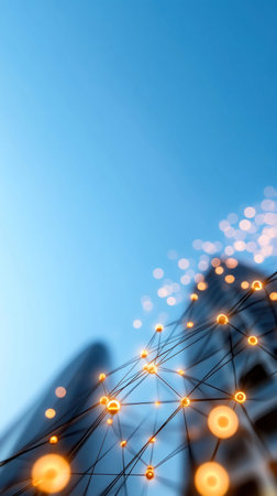 An abstract image of a network of lights and connections against a blue sky background.