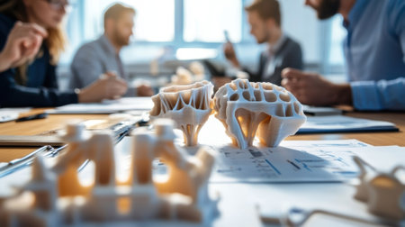 A medium closeup of a collaboration meeting between engineers and medical professionals with 3D printed prototypes of custom implants laid out on the table emphasizing the teamwor