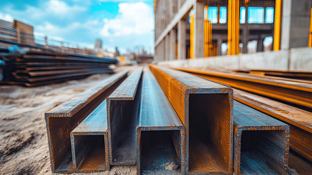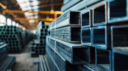 Rows of glaming metallic bars are neatly arranged in a vast factory, evoking a sense of precision and industrial strength ready for fabrication.