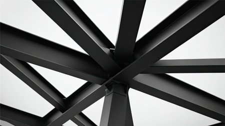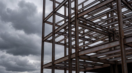 Sunlit steel girders form an intricate lattice, casting golden hues against a blurred industrial sky, highlighting modern construction strength and precision.