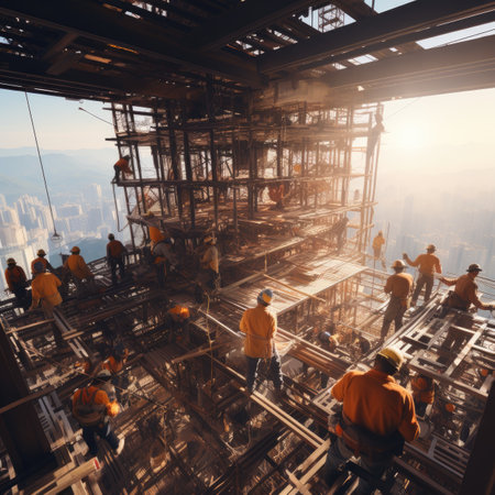 A dynamic urban construction site featuring a steel framework with a rising skyscraper against a clear blue sky, highlighting modern architectural development and industry progress.