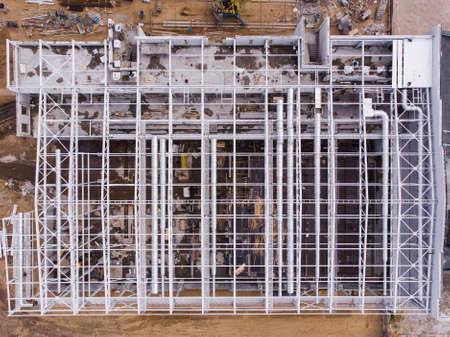 Aerial flight over a construction site.Building frame.Top view.Aerial photo