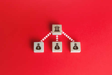 Currencies money bags are connected to the bank by lines . Financial system, national foreign exchange reserve concept. Currency exchange. Attraction of credit resources on capital markets.