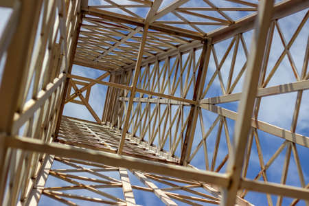 Roofing Construction. Wooden Roof Frame House Construction. Abstract Structure background. Wood texture pattern. Architecture minimal concept. Visual art. Conceptual photography.