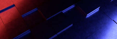 Abstract technological background made of metal cubes with red and blue light. 3D rendering.