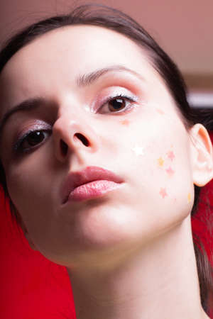 woman with sparkles on her face, close-up portrait