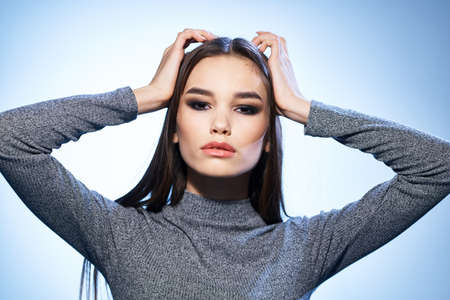 beautiful woman bright makeup gray jacket attractive look luxury model studio