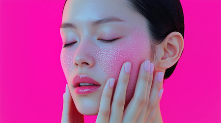 A woman gently applying a skincare product to her face against a bright pink background in a minimalist setting