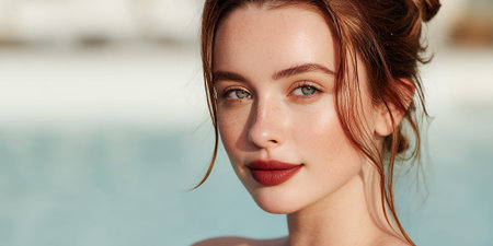 A young woman with freckles and red lipstick poses for a portrait with a blurred background of water.