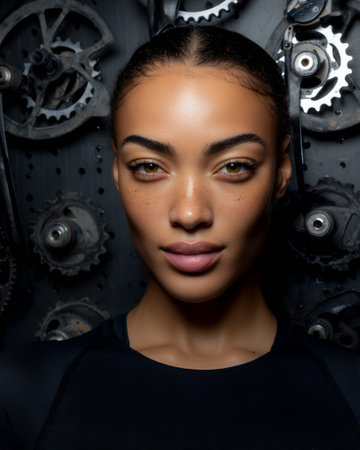 A close-up portrait of a young woman with freckles and striking green eyes, wearing a black athletic top. She is positioned in front of a dark background adorned with various gears and mechanical components, suggesting a theme of strength, industry, or perhaps a fitness-related context.