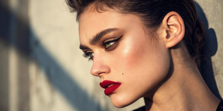 A woman poses with striking makeup featuring red lips and glittering eye shadow. Her glowing skin and captivating gaze enhance the beauty of the look, set against a softly blurred background.